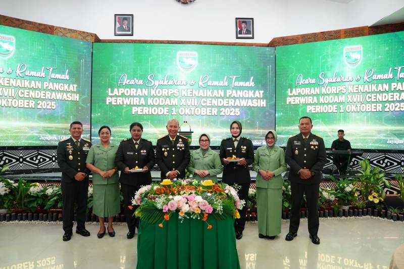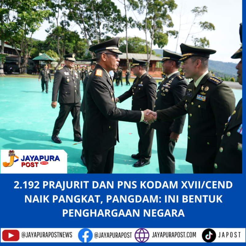 JAYAPURA , Jayapura Post.Com – Sebanyak 2.192 prajurit dan Pegawai Negeri Sipil (PNS) Kodam XVII/Cenderawasih resmi menerima kenaikan pangkat. Upacara laporan korps dipimpin langsung Pangdam XVII/Cenderawasih Mayjen TNI Amrin Ibrahim, S.I.P., didampingi Ketua Persit KCK Daerah XVII/Cenderawasih Ny. Surry Amrin Ibrahim, di Aula Tony Rompis Makodam XVII/Cenderawasih, Rabu (1/10/2025).