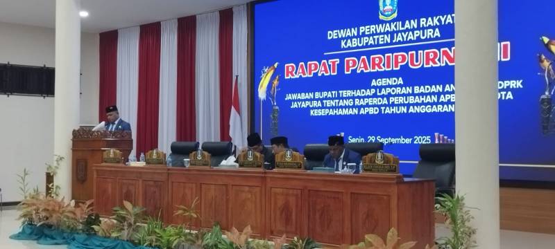 Jawaban Bupati Jayapura Dr. Yunus Wonda, S.H., M.H., disampaikan oleh Wakil Bupati Jayapura Haris Richard S. Yocku, S.H., menyampaikan apresiasi dan terima kasih yang sebesar-besarnya kepada DPRK Jayapura Papua, yang telah bekerja dengan maksimal dalam menjalankan fungsinya guna membahas dan mengevaluasi Nota Keuangan serta Raperda tentang APBD Perubahan Kabupaten Jayapura Tahun Anggaran 2025.