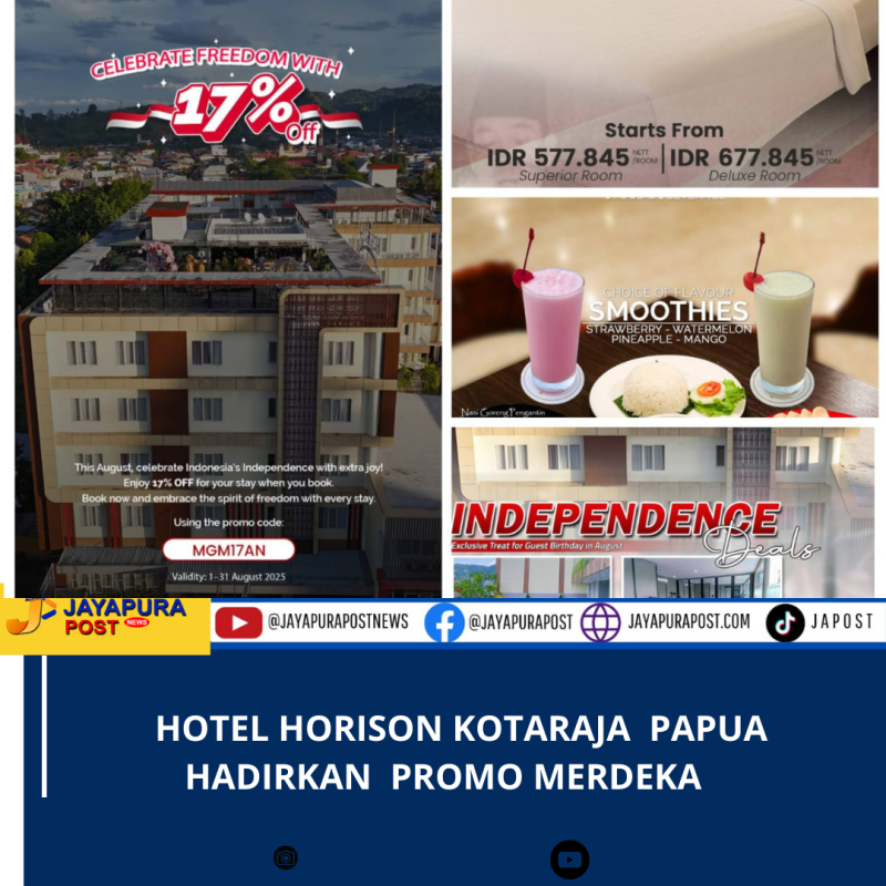 JAYAPURA, Jayapura Post.Com – Menyambut Hari Ulang Tahun ke-80 Kemerdekaan Republik Indonesia, Hotel Horison Kotaraja Papua menghadirkan deretan promo spesial yang berlaku sepanjang Agustus 2025. Penawaran ini mencakup paket menginap, promo kuliner, hingga makan malam romantis dengan suasana eksklusif, dirancang untuk memberi pengalaman tak terlupakan bagi para tamu.